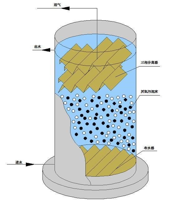 亦称上流式厌氧污泥床,适用于高浓度有机废水处理(通常COD>5000mg/L),在养殖、屠宰、食品加工、淀粉及酒精等行业中,其有机污染物的去除效率可达80%-90%。
